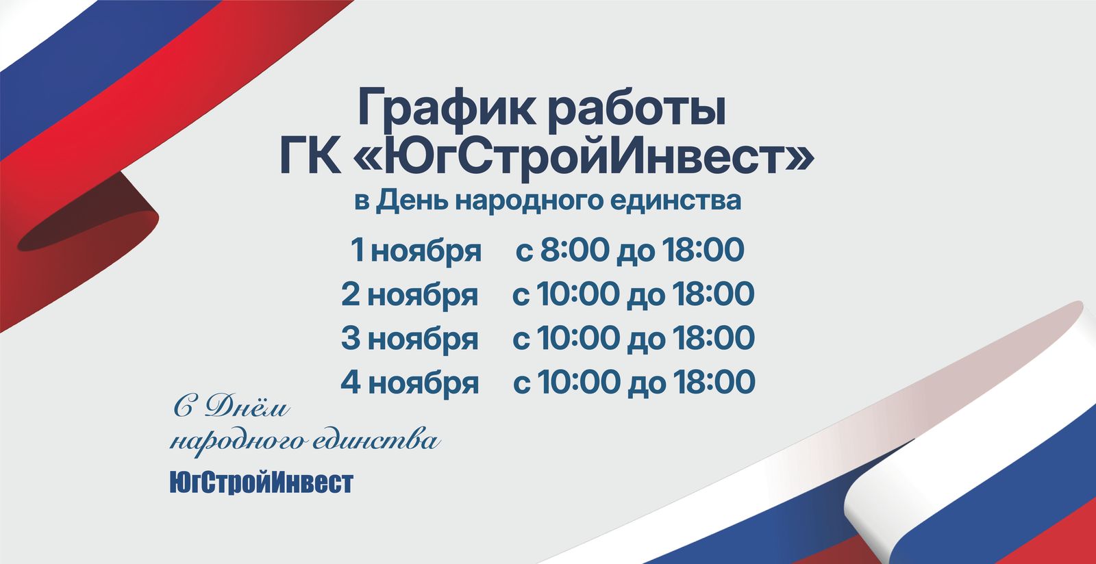 Для вашего удобства 2, 3 и 4 ноября мы работаем по графику: